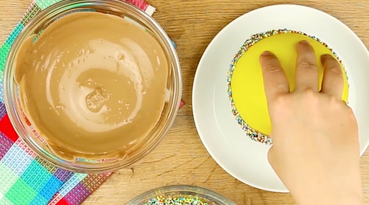 2. Nun tauchst du einen kleinen aufgeblasenen Luftballon bis zur Hälfte in die flüssige Schokolade. Wasserbomben eignen sich für diese Größe am besten. Nach der Schokolade geht es direkt ins Zuckerperlen-Tauchbad. Der Luftballon kommt zum Aushärten und Abkühlen am besten in den Kühlschrank.