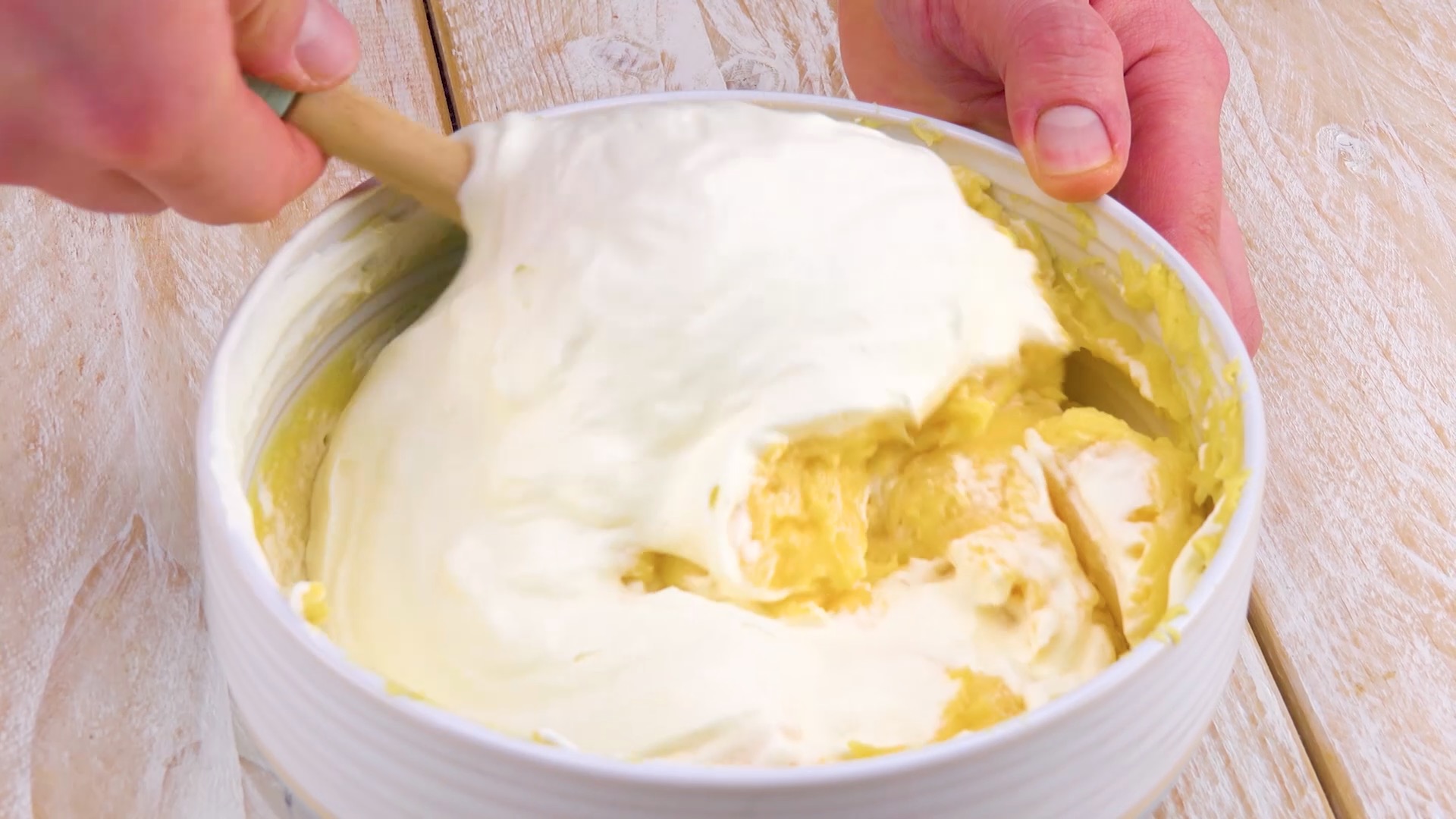 - Fülle den Teig in eine Schüssel und rühre jedes Ei einzeln unter, sodass der Teig schön geschmeidig wird.