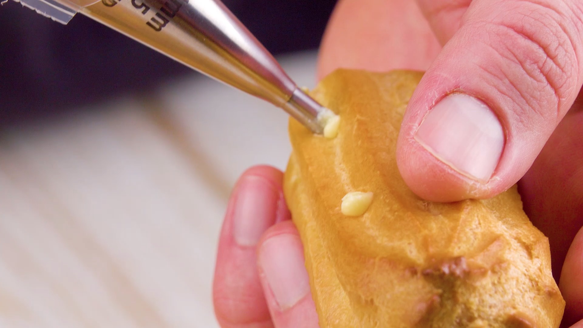 - Nimm den mit Creme gefüllten Spritzbeutel und stich damit in die Éclairs. Sobald die Creme an den Löchern rausguckt, hast genug Creme hineingespritzt.