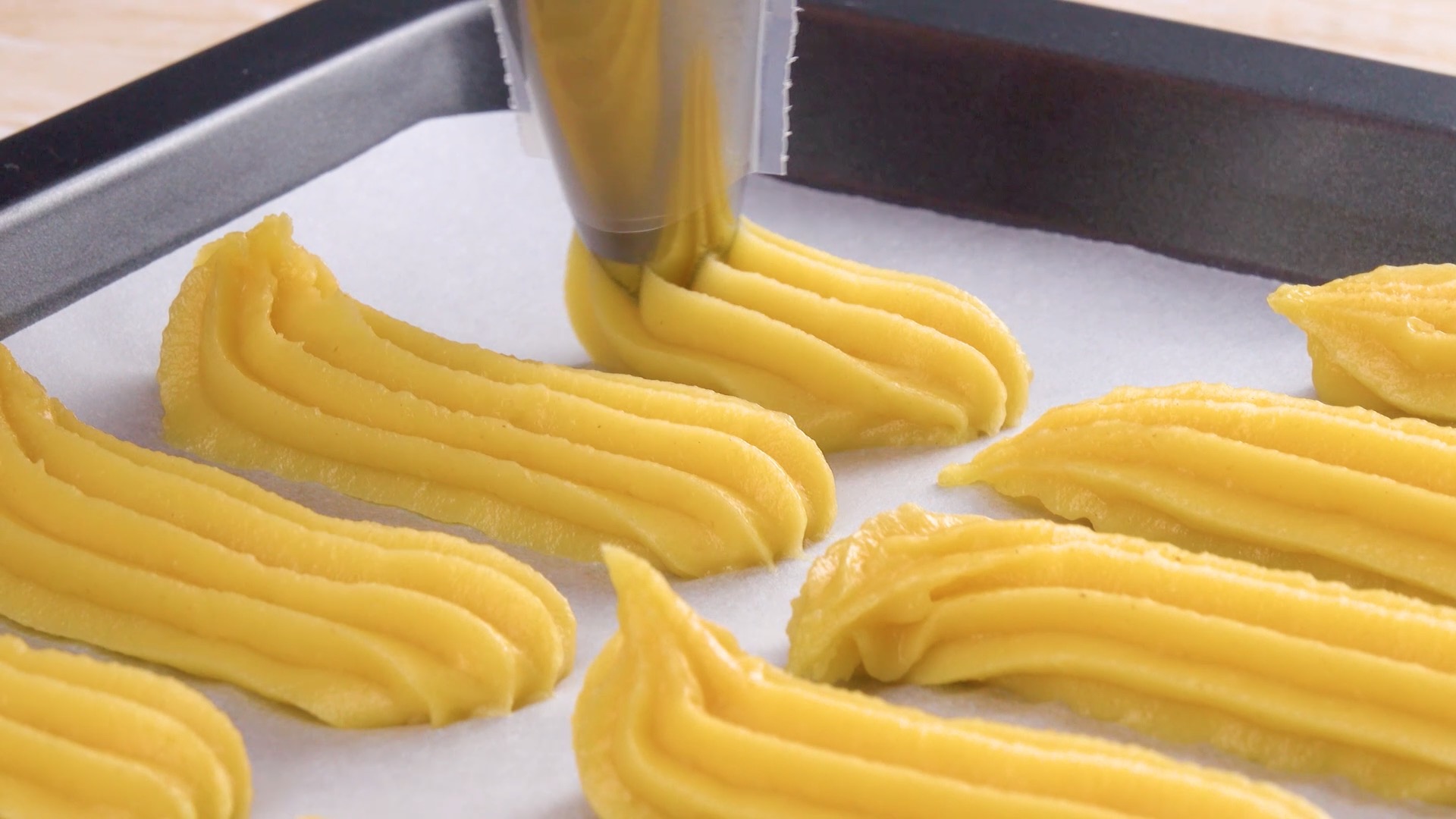 - Fülle den Teig in einen Spritzbeutel, spritze einige Stangen auf ein Backblech und backe diese im vorgeheizten Ofen bei 190 °C Umluft 30 Minuten lang. Lasse die Ofentür durchweg geschlossen, da die Éclairs sonst in sich zusammenfallen könnten.