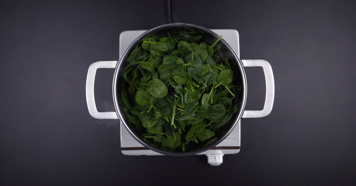 2.) Schwitze nun in einem Topf die Zwiebel und den Knoblauch mit Olivenöl an. Füge den Spinat hinzu und lass ihn ungefähr 5 Minuten dünsten. Währenddessen immer wieder umrühren, damit er nicht anbrennt.