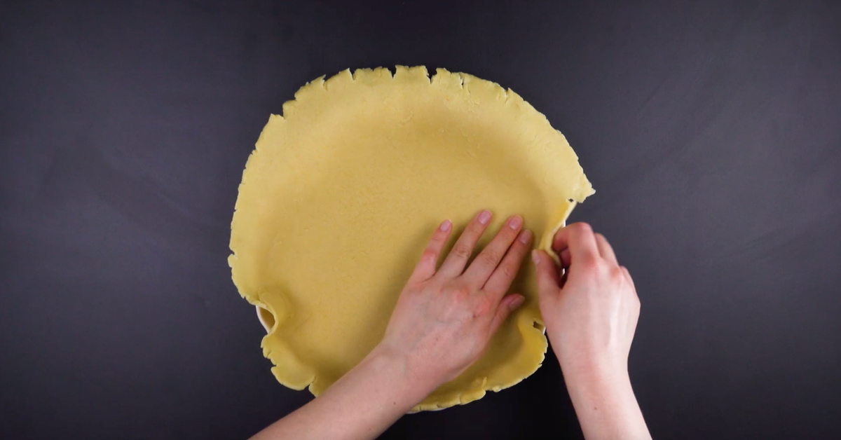 1.) Koche die Makkaroni in Salzwasser und lass sie abtropfen. Bereite nun den Teig zu, indem du die Zutaten für diesen mit der Hand knetest und anschließend ausrollst. Lege den Teig in einer Quiche-Form aus. Den überstehenden Rand kannst du abschneiden.