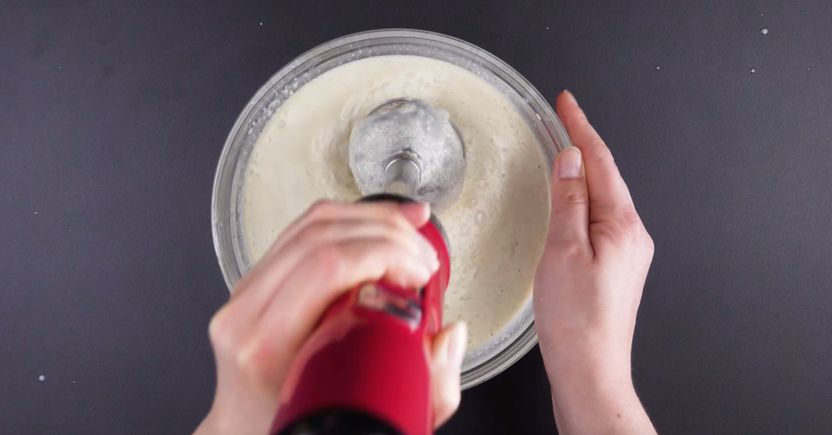 3.) Für die Soße pürierst du die Zutaten in einer Schüssel. Beim Würzen kannst du ruhig großzügig sein.