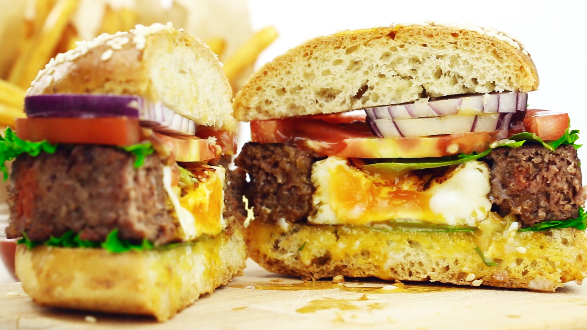 Wenn du nicht nur zum Frühstück Ei liebst, klicke hier in das ganze Rezept für den Burger mit Füllung.