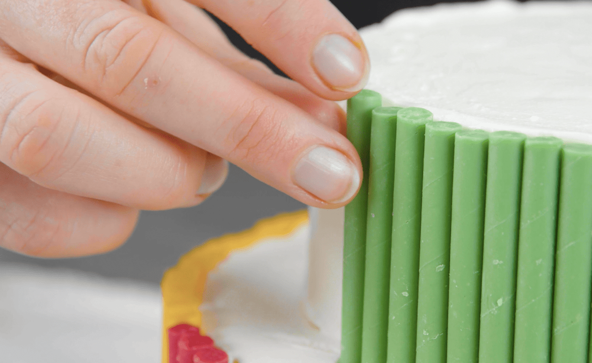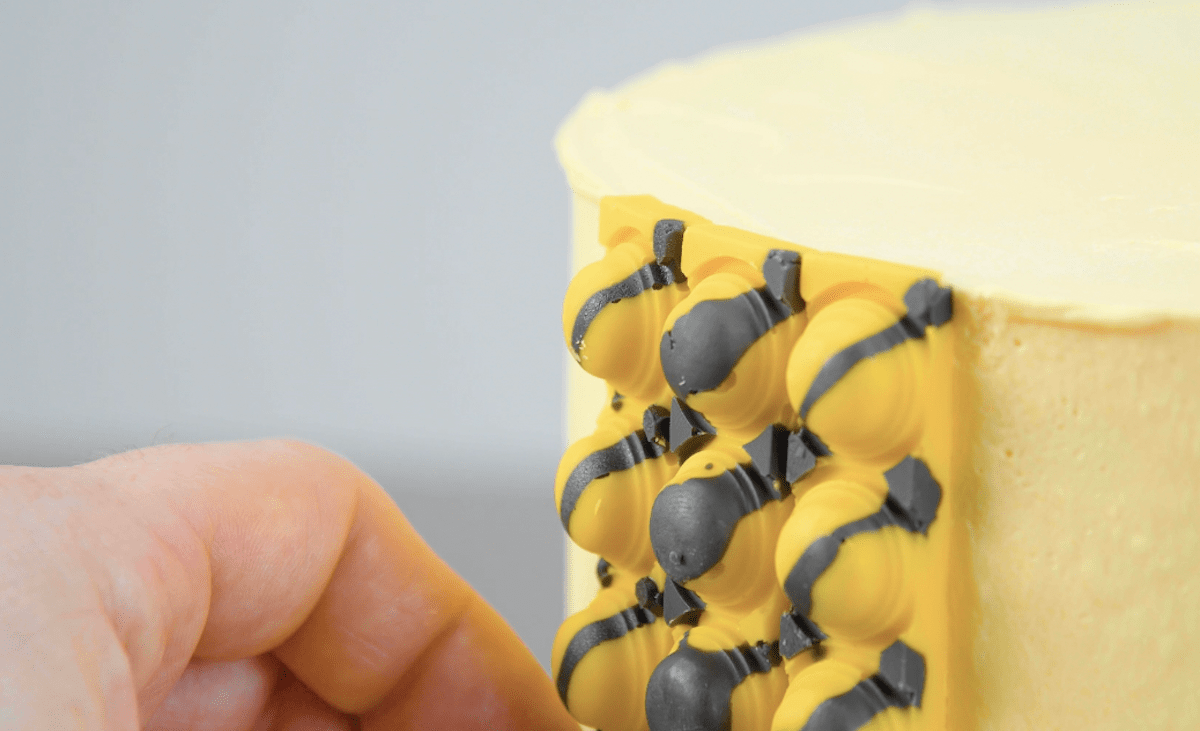 1.3 Gieße die temperierten schwarzen Candy Melts in Streifen auf eine Pop-it-Form. Lass sie für ca. 2 Minuten aushärten und gieße dann die Form komplett mit den temperierten gelben Candy Melts aus. Lege die Form für 2 Stunden in den Kühlschrank. Löse die fest gewordenen Riegel vorsichtig aus der Form. Drücke sie daraufhin hochkant an den Kuchenrand. Stelle den Kuchen für 60 Minuten kalt.