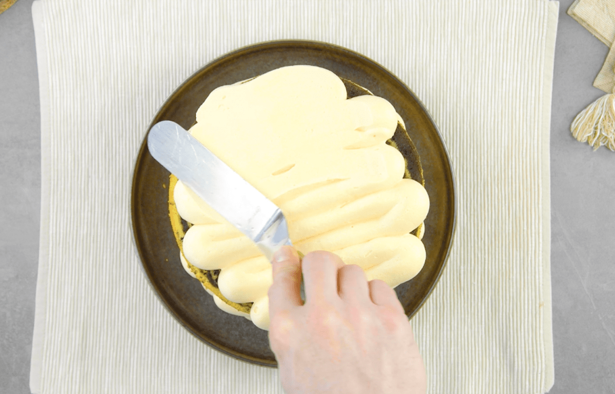 1.2 Verrühre Frischkäse mit Puderzucker und Sahnesteif und hebe dann geschlagene Sahne unter. Färbe sie mit gelber Lebensmittelfarbe ein (die Creme lässt sich besser verteilen, wenn sie vorher 1 bis 2 Stunden kalt gestellt wurde). Bestreiche die Kuchenteile mit der Frischkäsecreme und staple sie aufeinander. Streiche den Kuchen komplett mit der Creme ein.