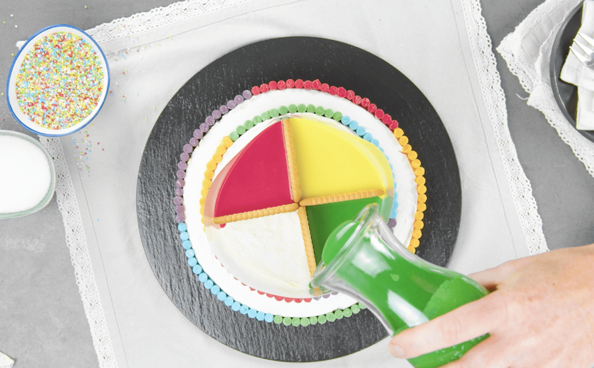 2.6 Stecke die 4 Butterkekse kreuzförmig auf den oberen Kuchen und stelle den kompletten Kuchen für 60 Minuten kalt. Lege dann einen Tortenring um die Kekse und fülle in die vier Kammern die bunten Glasuren.