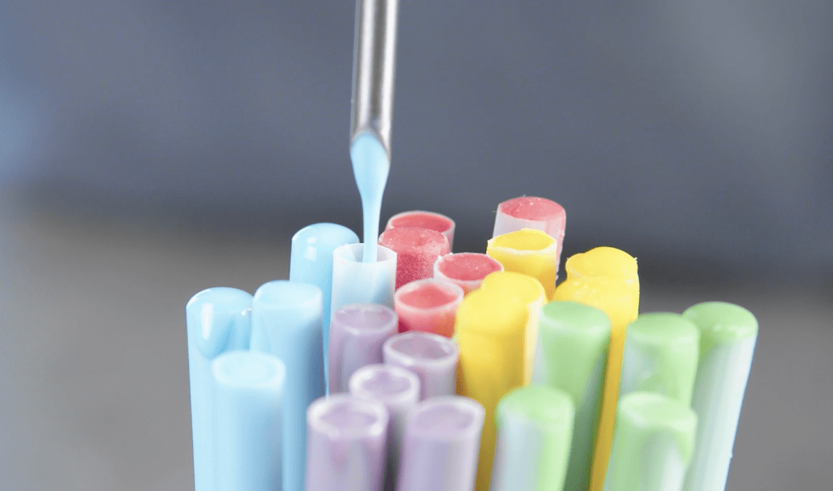 2.2 Gib in ein hohes Glas etwas Butter und stecke die Strohhalme hinein (so kann das geschmolzene Candy Melt später nicht herauslaufen). Erwärme die Candy Melts für 30 Sekunden in der Mikrowelle, dann verrühren und nochmals erhitzen, bis eine flüssige Masse entstanden ist. Fülle die Strohhalme mit der bunten Masse und stelle das ganze Glas für 60 Minuten in den Kühlschrank. Drücke danach die fest gewordenen Stäbchen mit einem Holzstab o.ä. vorsichtig aus den Strohhalmen heraus.