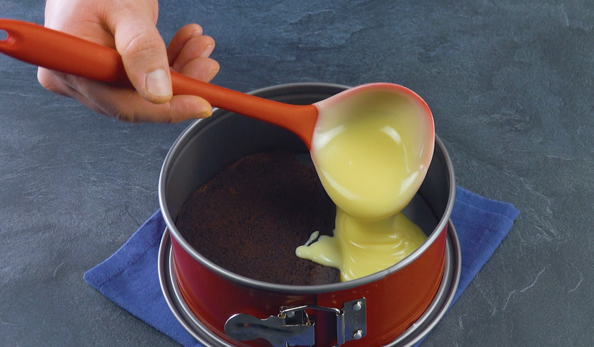 3.2 Schneide den Kuchen in 5 Dreiecke und stelle diese in gleichmäßigen Abständen in eine Springform (am besten dichtest du die Springform auf dem Boden mit Frischhaltefolie ab).