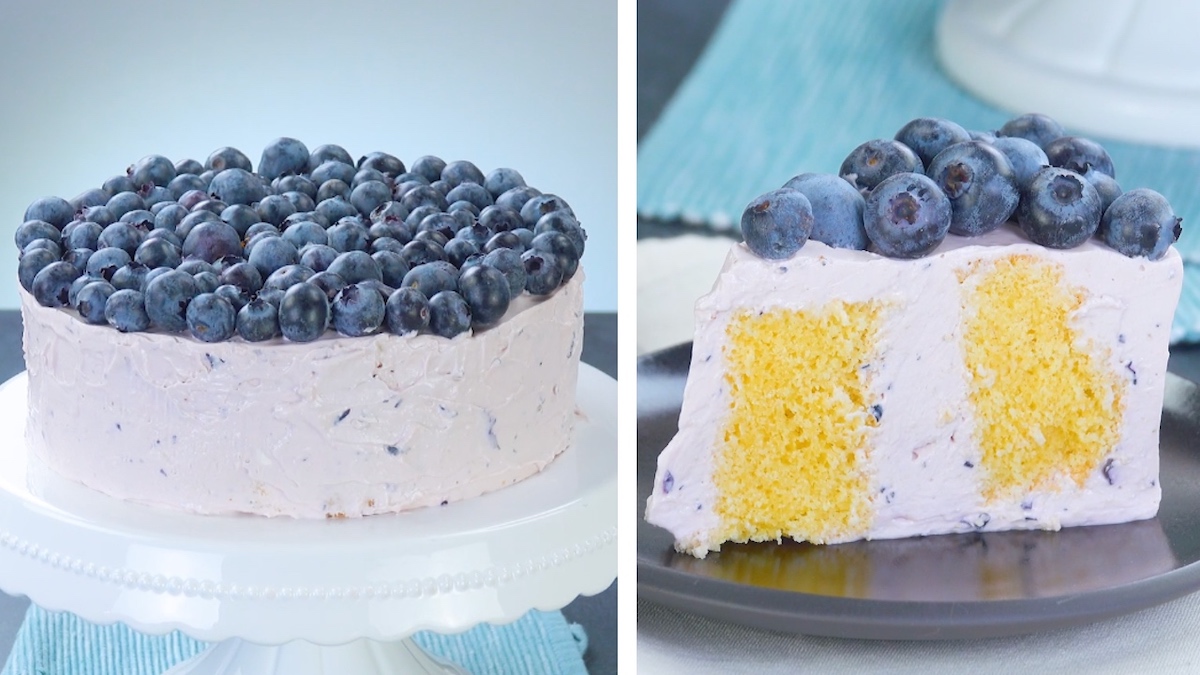 2.3 Schneide den Kuchen in 4 gleich dicke Scheiben und lege diese in gleichmäßigen Abständen in eine Springform. Fülle die Zwischenräume in der Springform mit der Blaubeercreme und stelle den Kuchen für 2 Stunden in den Kühlschrank.