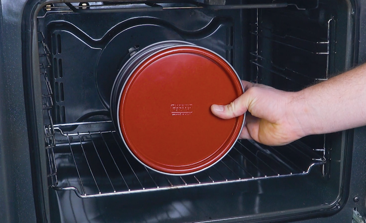 3.1 Schlage Butter und Zucker zusammen schaumig auf und gib nacheinander die Eier hinzu. Verrühre alles auf höchster Stufe und füge dann Mehl und Backpulver hinzu. Verrühre die Mischung weiter, bis sich alles verbunden hat. Fülle den Teig in die Springform, setze den Deckel darauf und stelle sie hochkant in den vorgeheizten Ofen. Backe den Teig für 40 Minuten bei 170 °C Ober- und Unterhitze und lasse den Kuchen nach dem Backen komplett auskühlen.