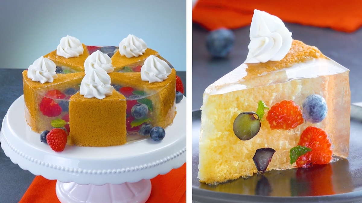 3.3 Verteile in den Zwischenräumen Beeren und Minze und fülle sie außerdem bis zur Hälfte mit dem flüssigen Gelee. Lasse alles etwas anziehen und gib erneut Beeren, Minze und Gelee hinzu. Stelle den Kuchen nun für 2 Stunden in den Kühlschrank.