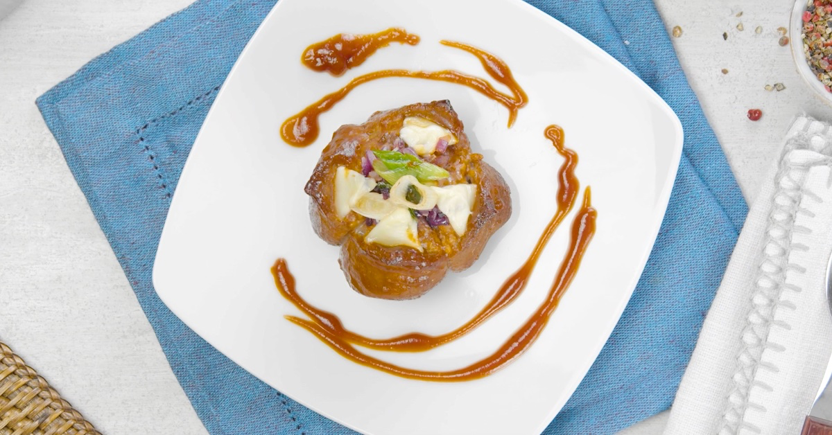 3.5 Klappe danach die Fleischecken nach außen um und bestreiche die Kugel an ihrer Außenseite mit der Barbecuesauce. Gare die Tulpe zum Schluss für 25 Minuten bei 175 °C Umluft.
