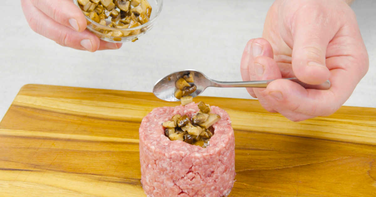 2.2 Entferne dann das Glas und den Ring und befülle die Mulde im Fleisch mit dem Feta und der Hälfte der Pilze.