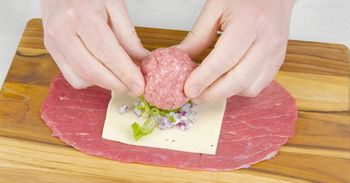 3.2 Gib dann die geschnittene Zwiebel und den Frühlingslauch auf den Käse. Forme danach das Hackfleisch mit den Händen zu einer Kugel und setze diese in die Mitte.