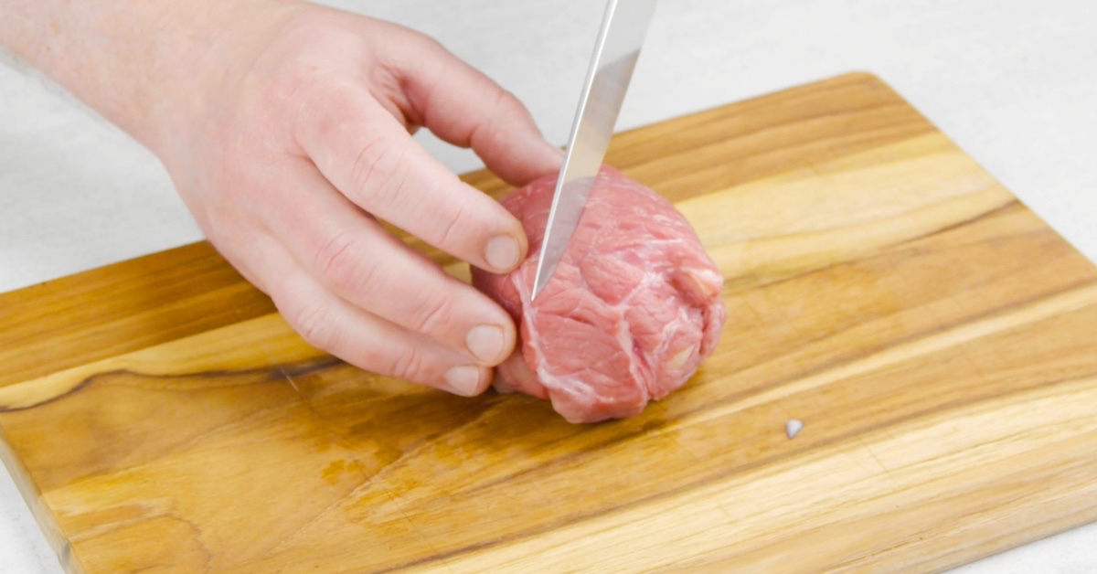 3.3 Klappe nun das Rindfleisch samt Käse um das Hackfleisch herum, sodass eine große Kugel entsteht. Drehe die Fleischkugel um und schneide sie oben mit einem Messer kreuzförmig ein.