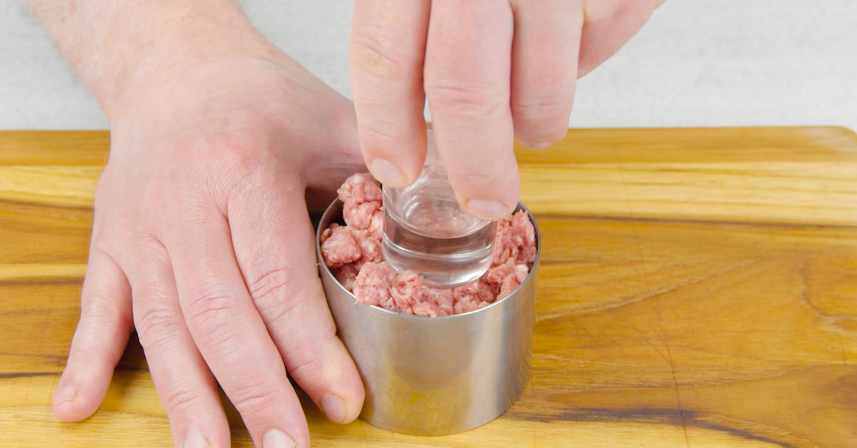 2.1 Fülle das Hackfleisch in den Dessertring und drücke es mit einem Shotglas mittig ein, sodass eine Mulde entsteht.