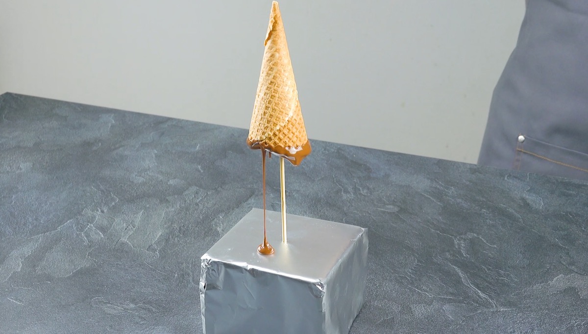 3.1 Schmilz die Kuvertüre in einem Wasserbad und gieße etwas davon in die Eiswaffel. Drehe die Waffel hin und her, sodass sich die Kuvertüre gleichmäßig verteilt, und dippe sie anschließend auch in die Kuvertüre, um den äußeren Rand ebenfalls mit Schokolade zu überziehen. Stich einen Schaschlikspieß in Steckmoos und setze die Eiswaffel darauf, bis die Kuvertüre fest geworden ist.