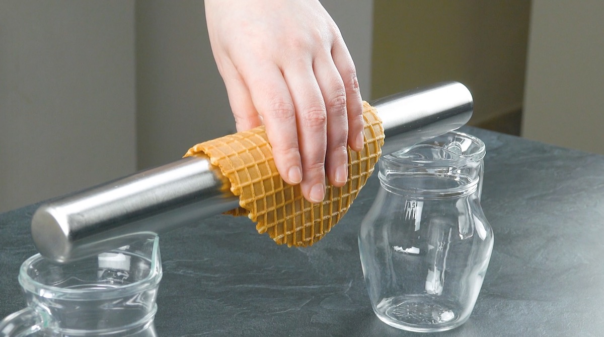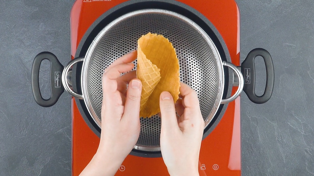 1.1 Bringe etwas Wasser in einem Topf zum Kochen. Hänge dann einen Siebeinsatz hinein und achte darauf, dass dieser das Wasser nicht berührt. Feuchte zwei Stück Küchenpapier an und stecke je ein Küchenpapier in eine Eiswaffel. Dämpfe die Waffeln dann nacheinander für je 2-3 Minuten; entferne das Küchenpapier und rolle die Eiswaffeln vorsichtig auseinander.