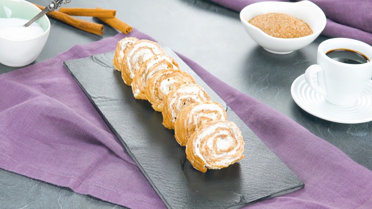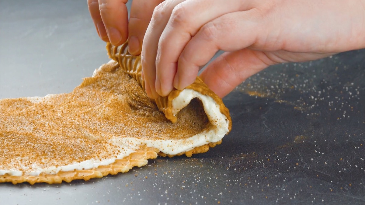 1.3 Vermenge Zimt und Zucker miteinander und verteile die Mischung gleichmäßig auf der Frischkäsecreme. Rolle die Waffeln dann zusammen.