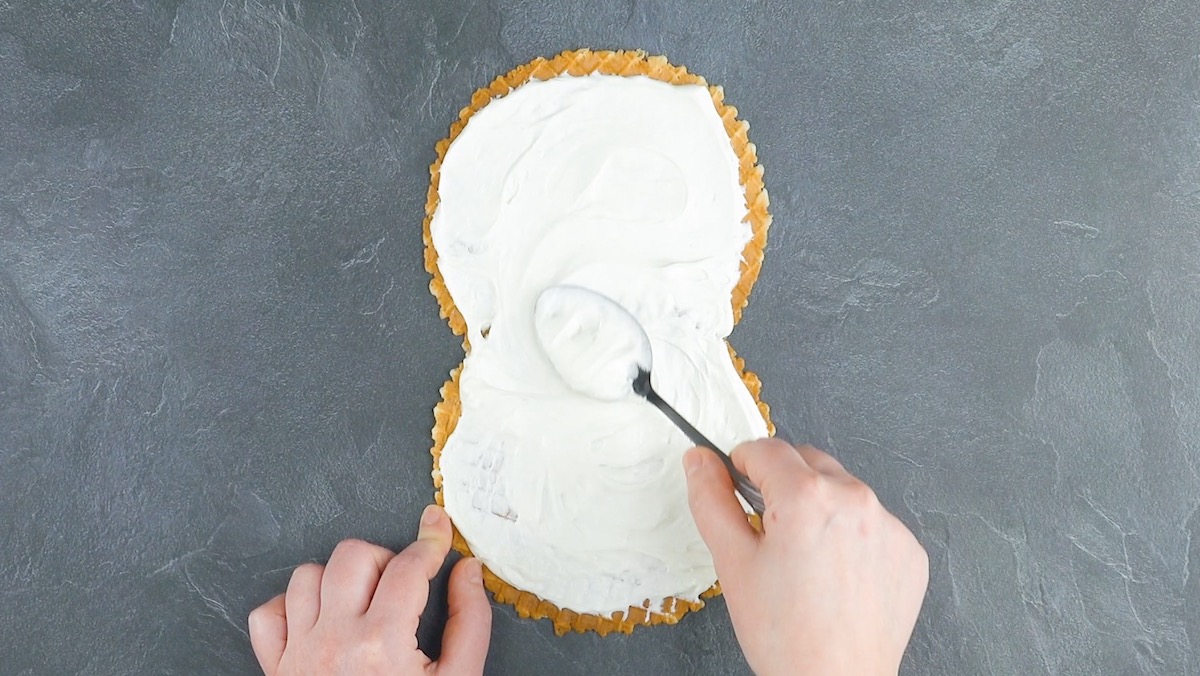 1.2 Rühre aus Puderzucker und Frischkäse eine Creme an. Lege die ausgerollten Eiswaffeln leicht überlappend auf die Arbeitsfläche und bestreiche sie mit der Frischkäsecreme.