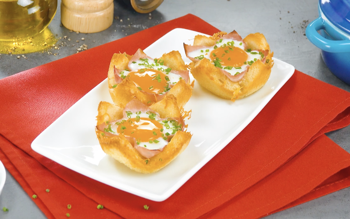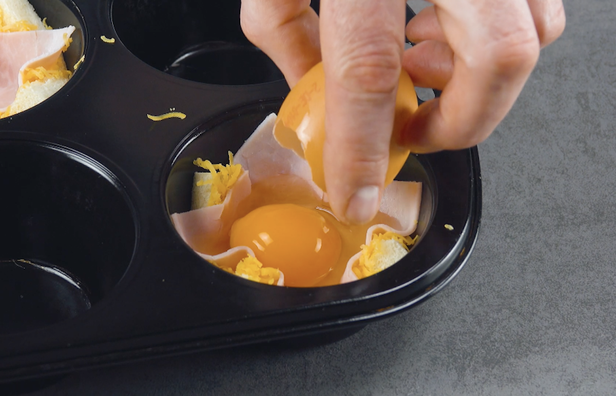 3.3 Gib jeweils ein Ei auf die Toast-Körbchen in den Mulden.