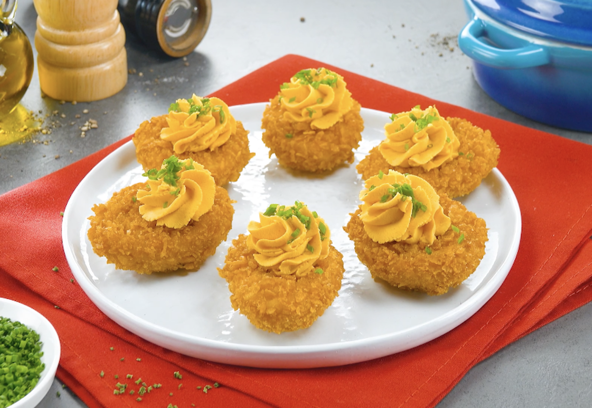 1.4 Fülle die frittierten Eier mit der Ei-Frischkäsecreme aus dem Spritzbeutel. Garniere die Eier mit Schnittlauch.