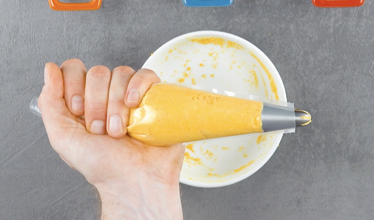 1.1 Koche die 3 Eier, halbiere sie und entferne das Eigelb. Vermische das Eigelb mit Frischkäse und Paprikapulver und schlage alles schaumig auf. Fülle die Creme in einen Spritzbeutel mit Tülle.