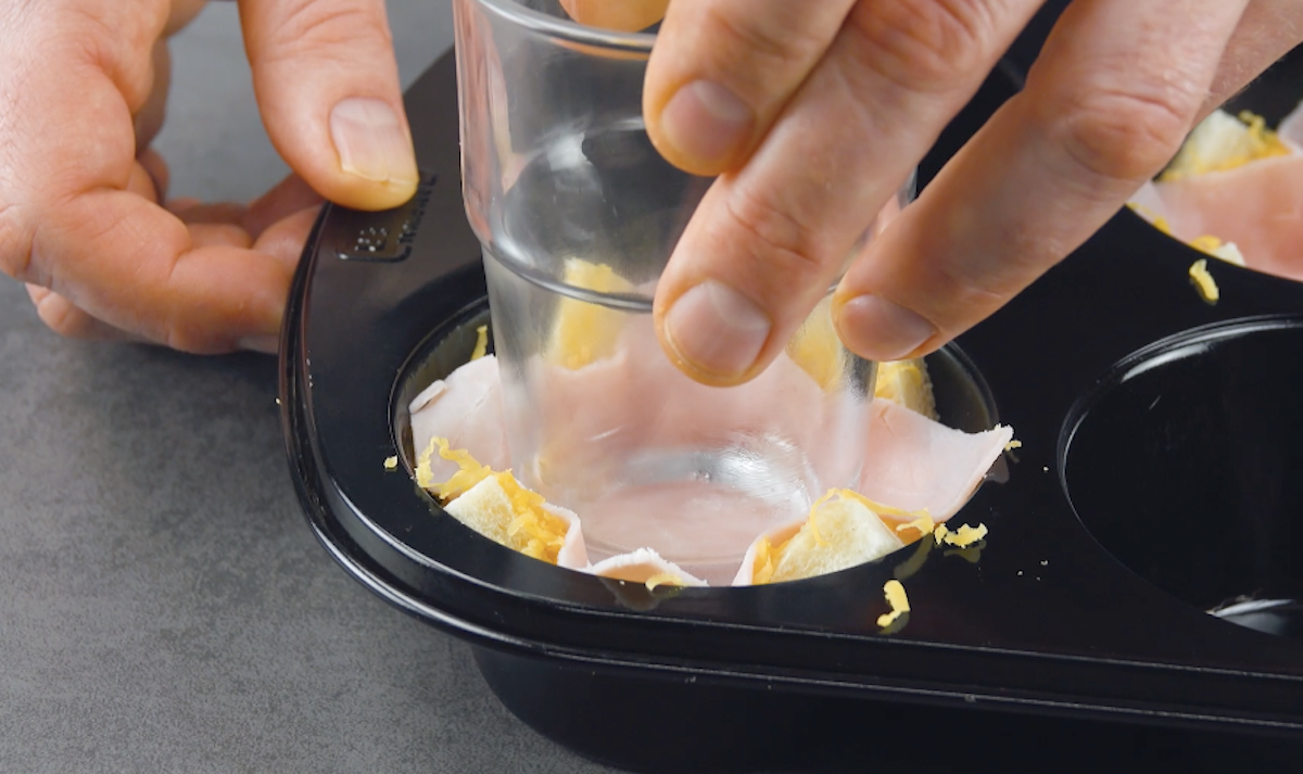 3.2 Reibe Cheddar über die Toastscheiben und lege jeweils eine Scheibe Kochschinken darauf. Lege die belegten Toastscheiben in die Mulden der Muffinform und drücke sie vorsichtig mit einem Glas herunter.