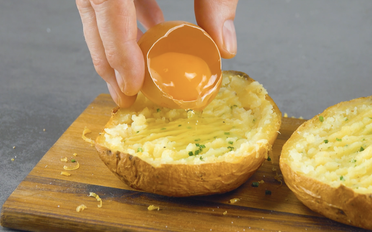 2.2 Reibe Käse über die Kartoffel, streue Schnittlauch, Salz und Pfeffer darauf und füge Butter hinzu. Vermische dann alles mit einer Gabel. Drücke das Innere mit der Gabel ein bisschen ein, damit eine Mulde entsteht. Schlag in die Mulde jeweils ein Ei.