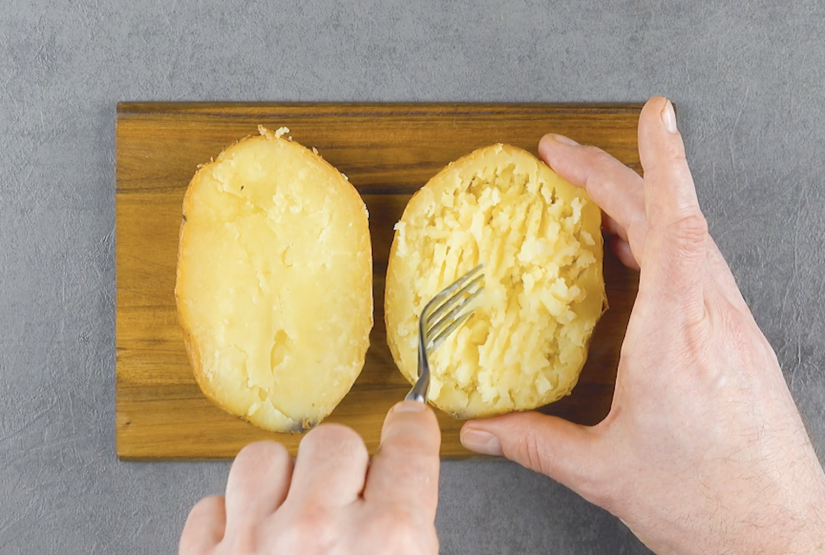 2.1 Halbiere die noch heiße Ofenkartoffel und lockere das Innere mit einer Gabel.