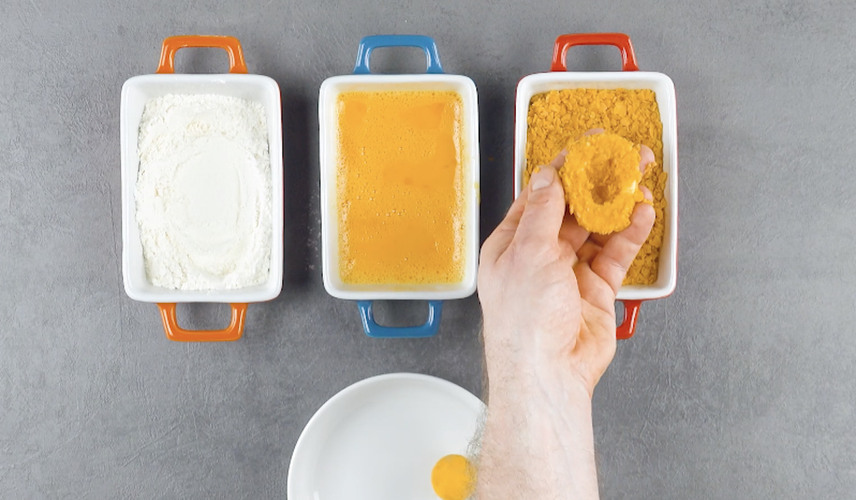 1.2 Bereite dann eine „Panierstraße“ zu: Zerkleinere Cornflakes und gib sie in eine Schale. In zwei weitere Schalen kommt jeweils Mehl und verquirltes Ei. Paniere die halbierten gekochten Eier (gegebenenfalls muss das auch mehrmals passieren).