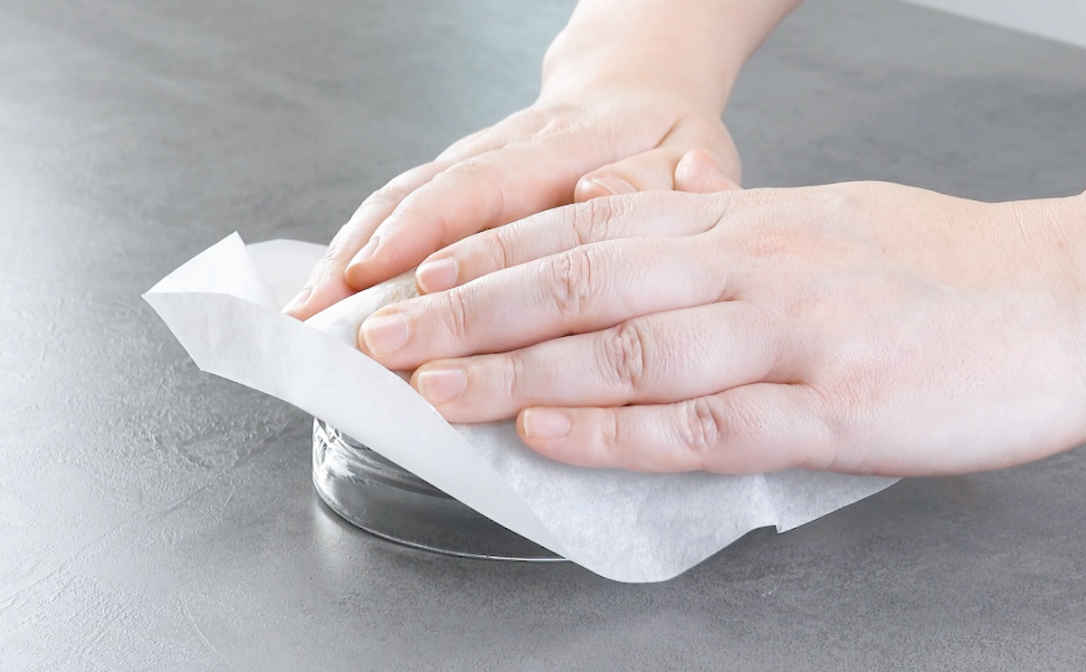 1.2 Stelle eine Schüssel kopfüber auf deine Arbeitsfläche und fette ihre Außenseite ein. Nimm dann das Backpapier mit dem geschmolzenem Karamell aus der Pfanne und lege die etwas abgekühlte, aber noch formbare Karamellmasse über die Schüssel. Drücke sie mit den Händen fest an – aber vorsichtig, das Karamell ist noch heiß.