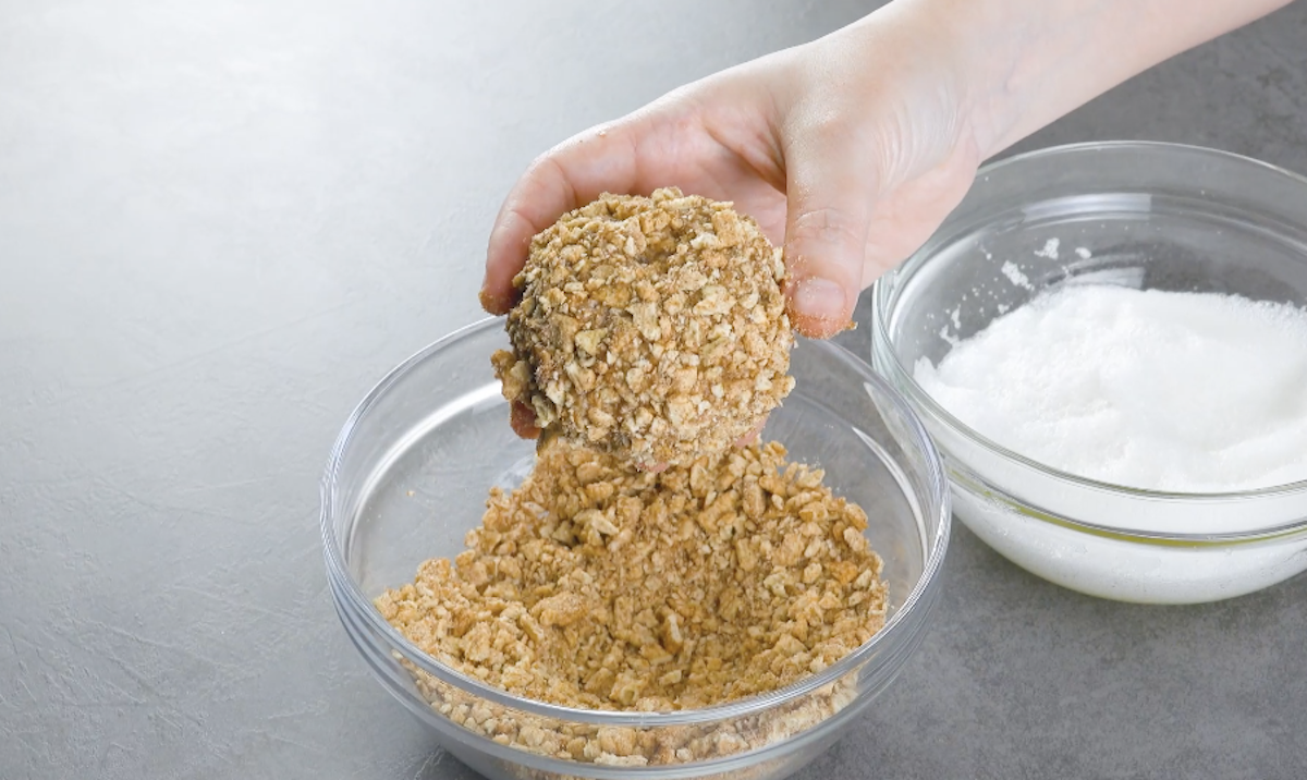 2.3 Entferne die Frischhaltefolie von den Eiskugeln. Wälze das Eis dann zuerst im Eiweißschaum und dann in einer der drei zerbröselten Panaden, und zwar: das Erdbeereis in den Oreo-Krümeln, das Schokoladeneis in den Cornflakes-Krümeln und das Vanilleeis in den Cini-Mini-Krümeln.