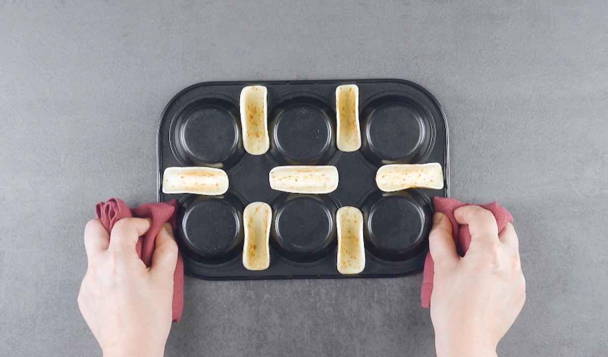 3.1 Stich aus einer großen Tortilla 7 gleich große Kreise aus. Bepinsle diese mit flüssiger Butter und stecke sie in die Zwischenräume einer umgedrehten Muffinform.