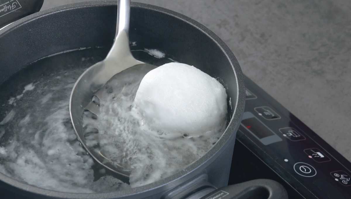 1.3 Schlage Eiweiß mit Puderzucker schaumig auf. Forme dann mit einem Eisportionierer aus dem festen Baiser Kugeln und pochiere diese kurz in heißem Wasser (das Wasser soll nicht kochen).