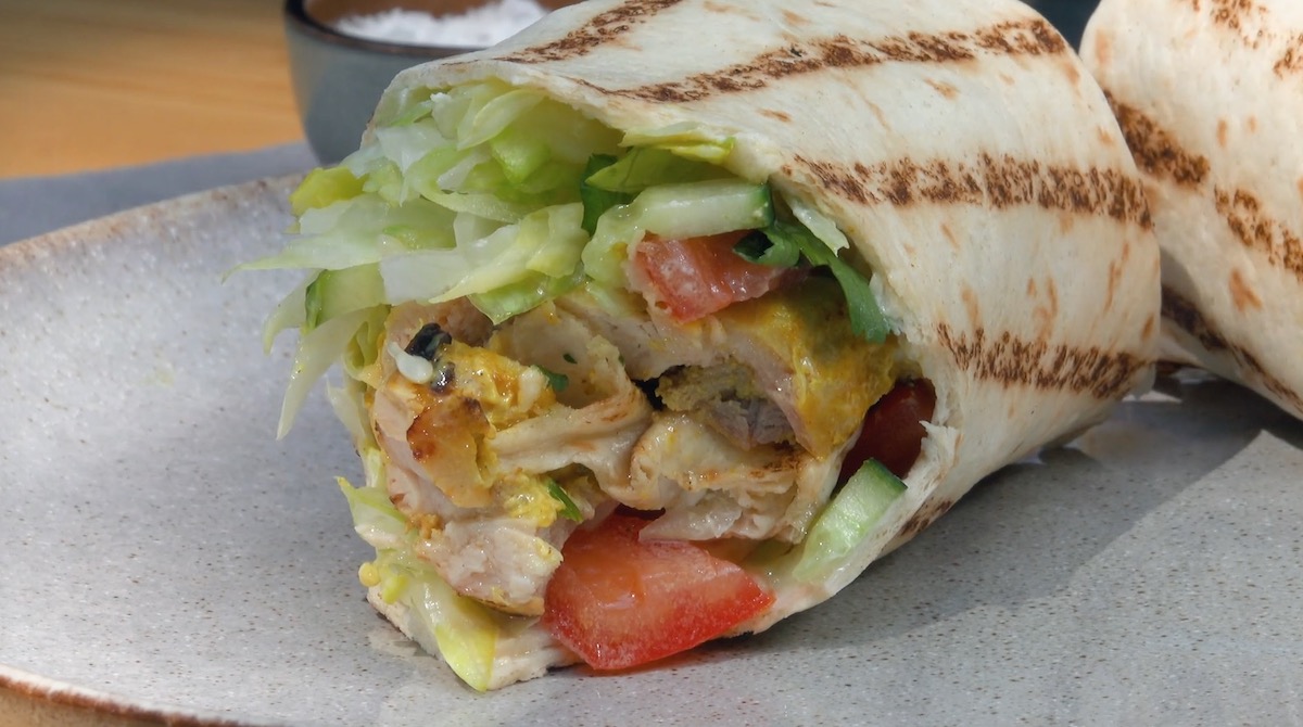 … und das Hähnchen mit der Curry-Marinade in einem Wrap.