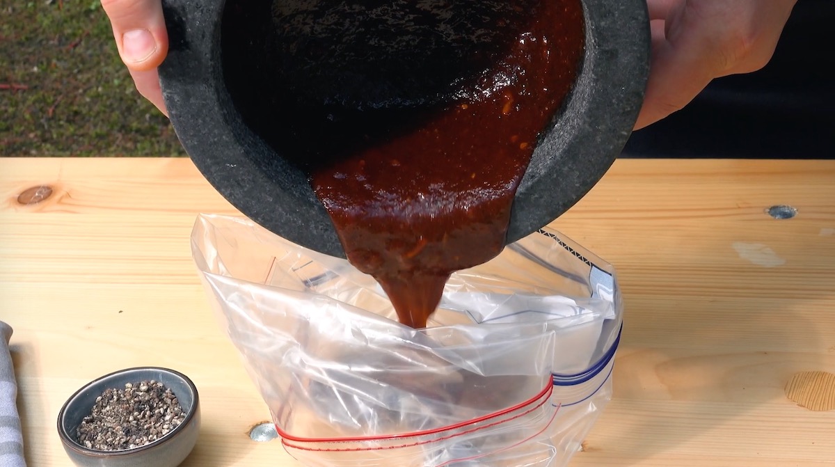 1. Zerkleinere für die BBQ-Marinade Pfeffer, Salz, Chili und Knoblauch in einem Mörser. Rühre dann die übrigen Zutaten hinzu; sollte dir die Marinade nicht flüssig genug erscheinen, kannst du sie mit Öl verdünnen. Fülle die Marinade anschließend in einen Gefrierbeutel.