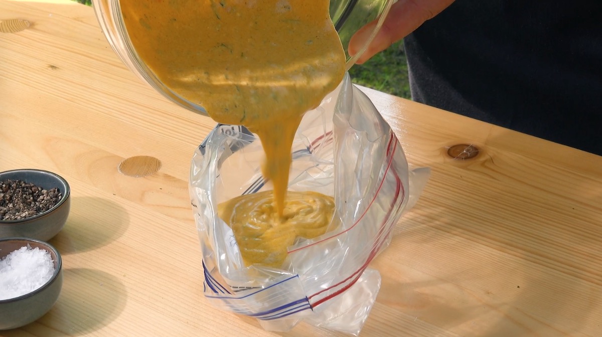 3. Vermische für die Curry-Marinade alle Zutaten in einer Schüssel miteinander. Fülle die Marinade anschließend in einen Gefrierbeutel.