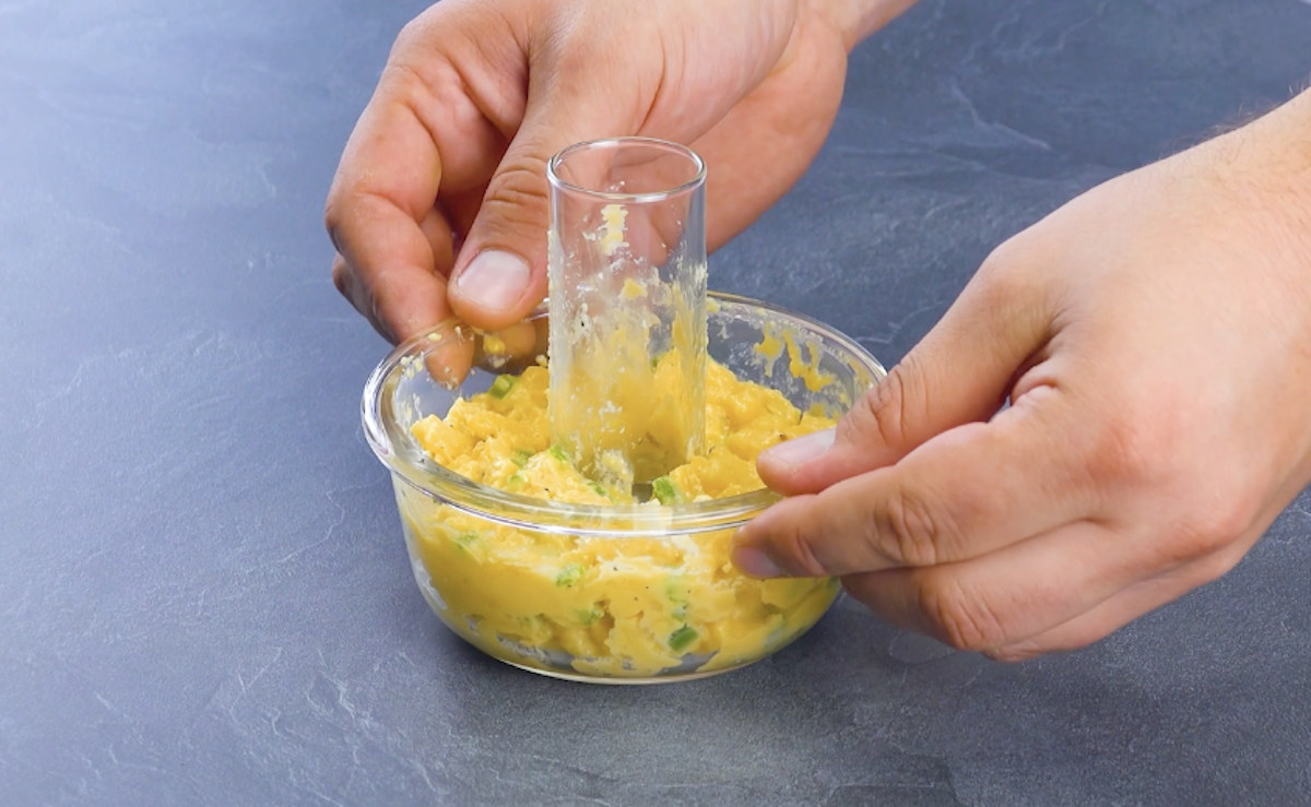 2.3 Ummantle den gefüllten Zwiebelring mit Kartoffelpüree und friere ihn für 1 Stunde ein.