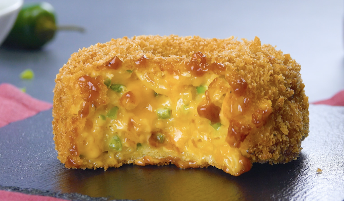 1.3 Paniere den gefrorenen Mac-and-Cheese-Ring und frittiere ihn in ca. 150 °C heißem Fett, bis er goldbraun ist.