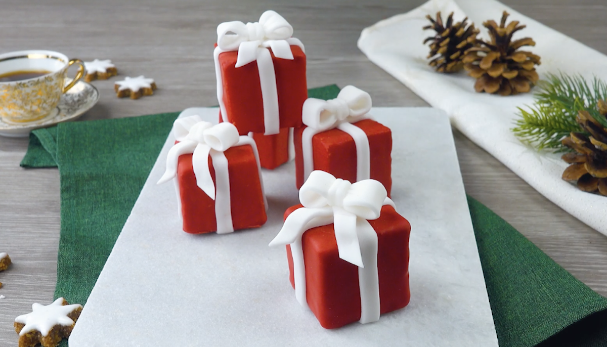 2.3 Rolle den weißen Fondant aus, schneide ihn in dünne Streifen und dekoriere mit ihnen das rote Kuchen-Geschenk. Forme aus dem Fondant außerdem eine Schleife und setze diese ebenfalls auf das Geschenk.