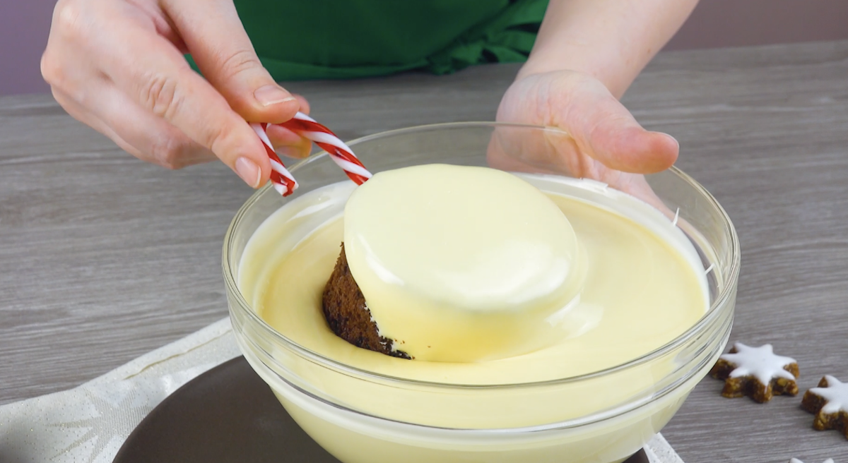 3.2 Temperiere die weiße Schokolade und tauche die runden Küchlein hinein.