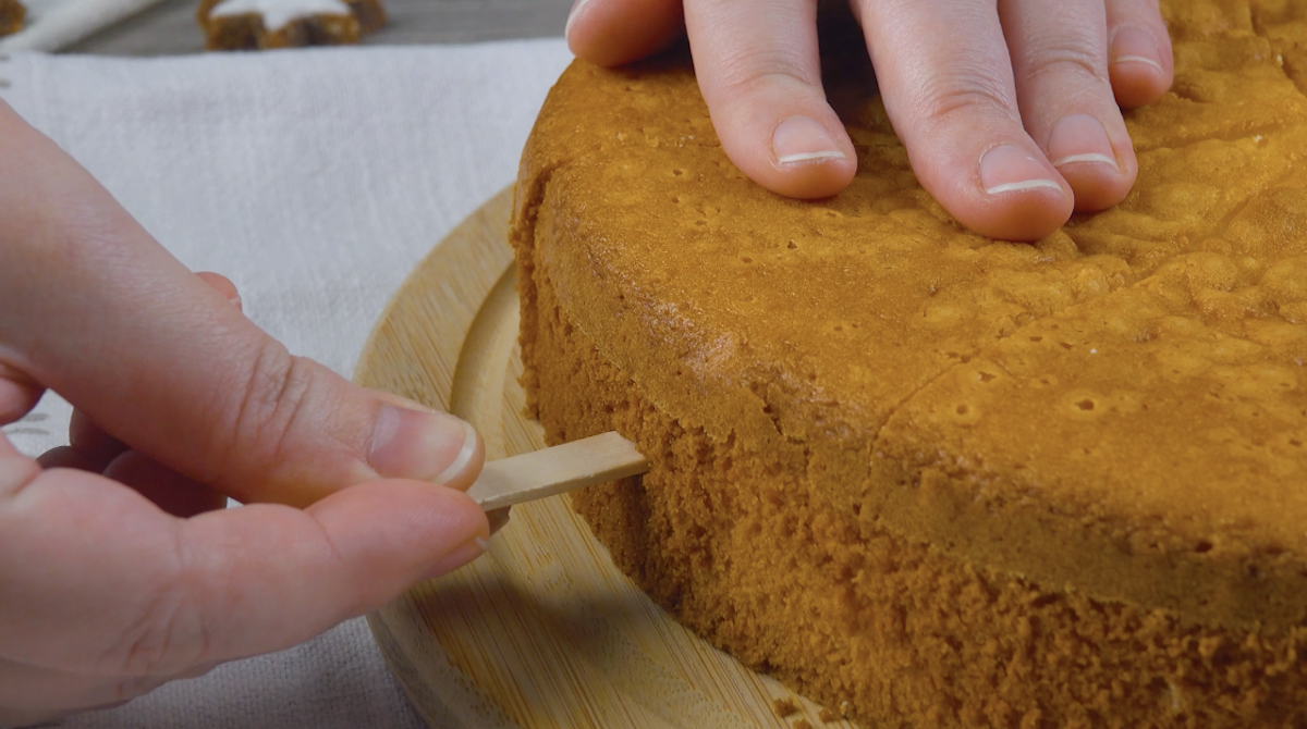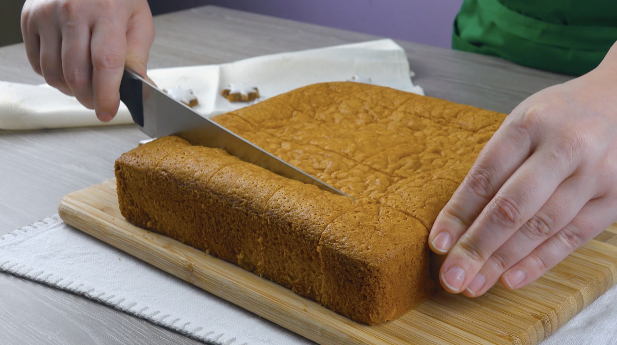 1.1 Schneide den Kuchen in 8 gleich große Stücke und stecke in jedes Stück einen Holzstiel.