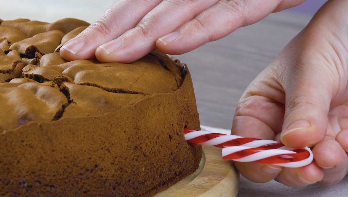 3.1 Stich mit dem Ausstecher 7 Kreise aus dem Kuchen aus. Stecke jeweils eine Zuckerstange seitlich in die ausgestochenen Kreise.