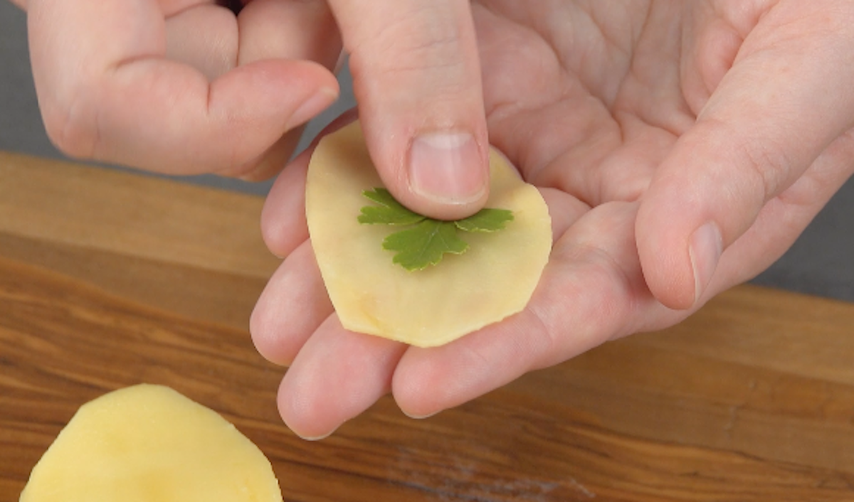 2.2 Lege jeweils ein Petersilienblatt auf eine Kartoffelscheibe und decke diese wiederum mit einer weiteren Kartoffelscheibe zu.