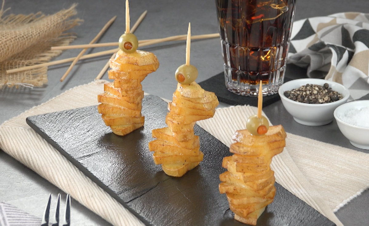 3.3 Drehe die einzelnen Scheiben, sodass eine kleine Wendeltreppe entsteht. Frittiere die Spieße in heißem Fett und stecke danach eine Olive obendrauf. Gib noch einen Klecks Ketchup dazu.