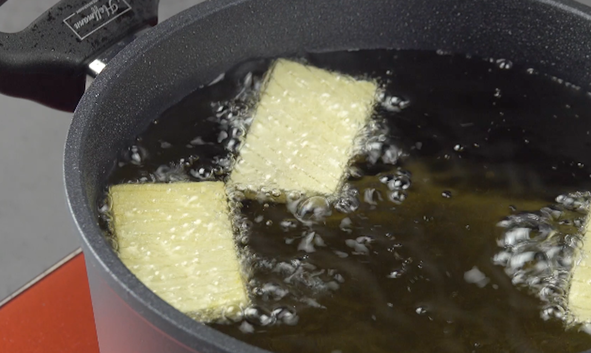 2.3 Frittiere die zusammengelegten Kartoffelscheiben in heißem Fett.