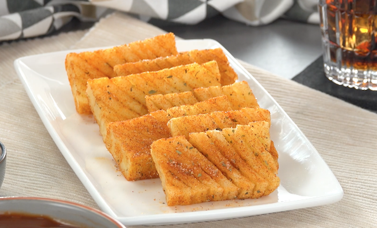 1.6 Wende die frittierten Akkordeon-Kartoffeln in einer Gewürzmischung (Salz, Knoblauchpulver, Paprikapulver und Oregano).