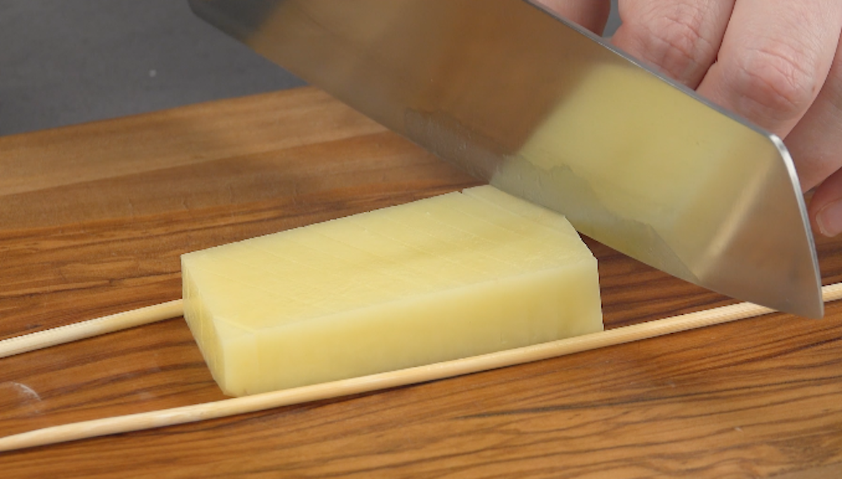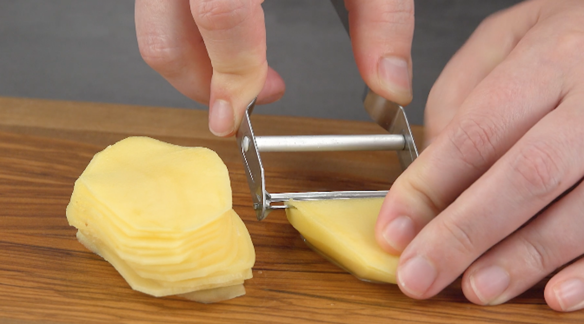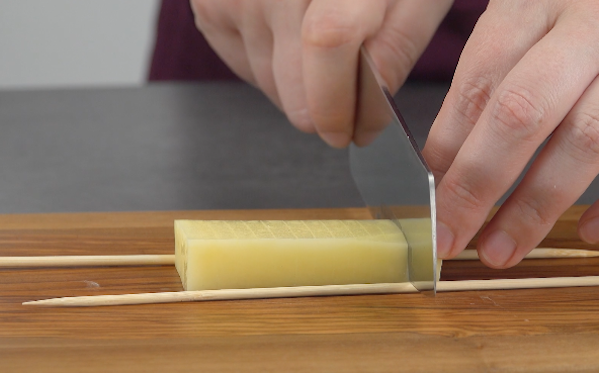 1.3 Lege die Scheiben auf deine Arbeitsfläche und platziere an den Längsseiten je einen Schaschlikspieß. Schneide die Kartoffeln zunächst vertikal in regelmäßigen Abständen von 2 mm bis zum Schaschlikspieß ein, aber nicht durch.
